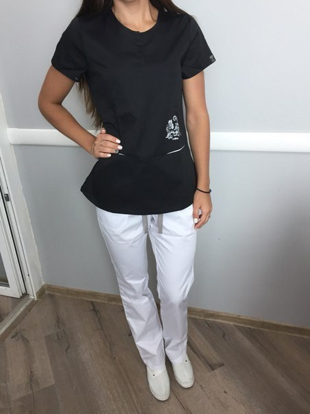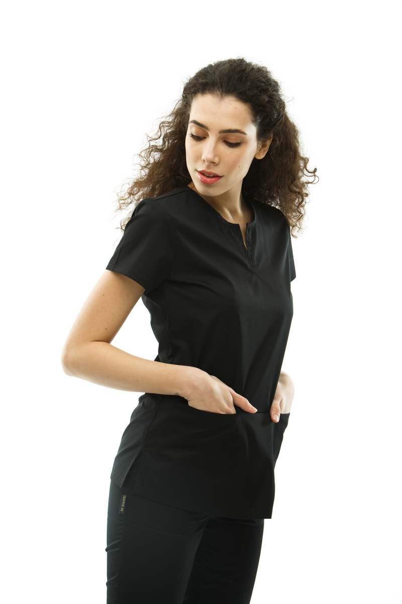 Dámská zdravotnická halenka 18 v černé barvě je moderní a pohodlný model polopřiléhavého střihu, určený pro lékaře, zdravotní sestry, stomatology, kosmetičky a další zdravotnický personál.