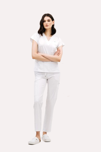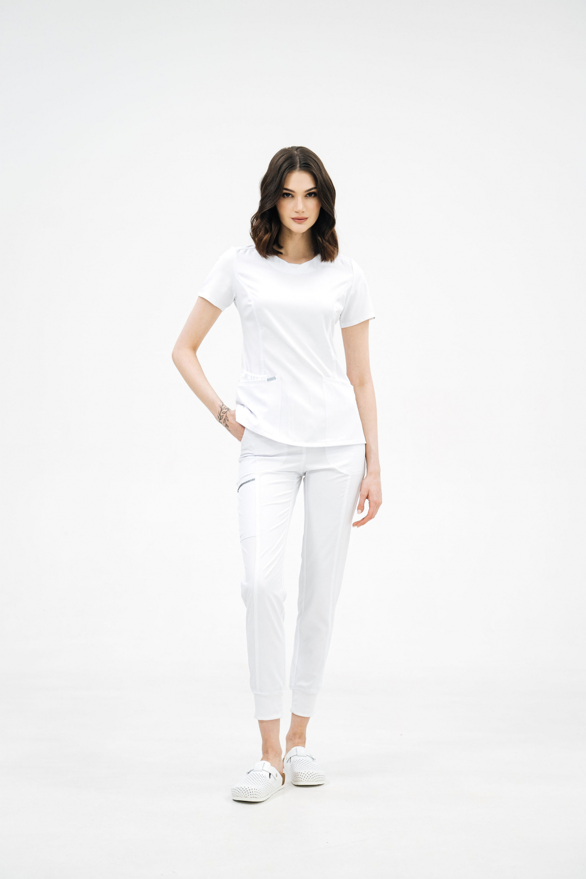 Жіноча медична хірургічна блуза з колекції InWhite Kapsula створена для максимального комфорту під час щоденної роботи. Сучасний крій з V-подібним вирізом та коротким рукавом забезпечує зручність та професійний вигляд протягом усієї зміни.
